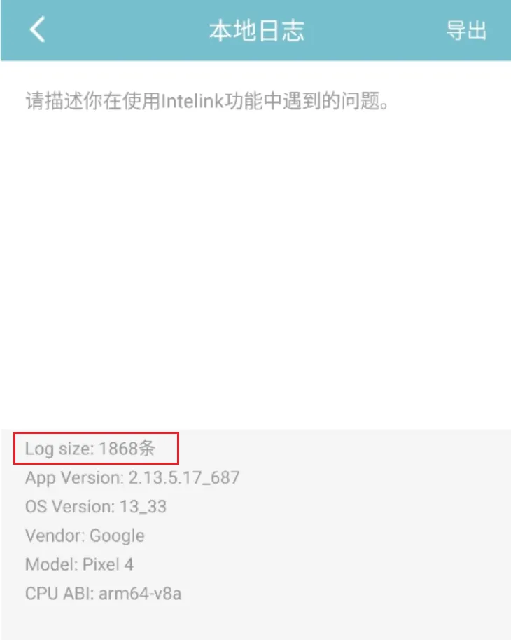 - 如果日志超过了 10,000 条,点击“导出”将日志保存在手机存储中,然后通过 IntelinkGO 或邮件的方式发送给我们。