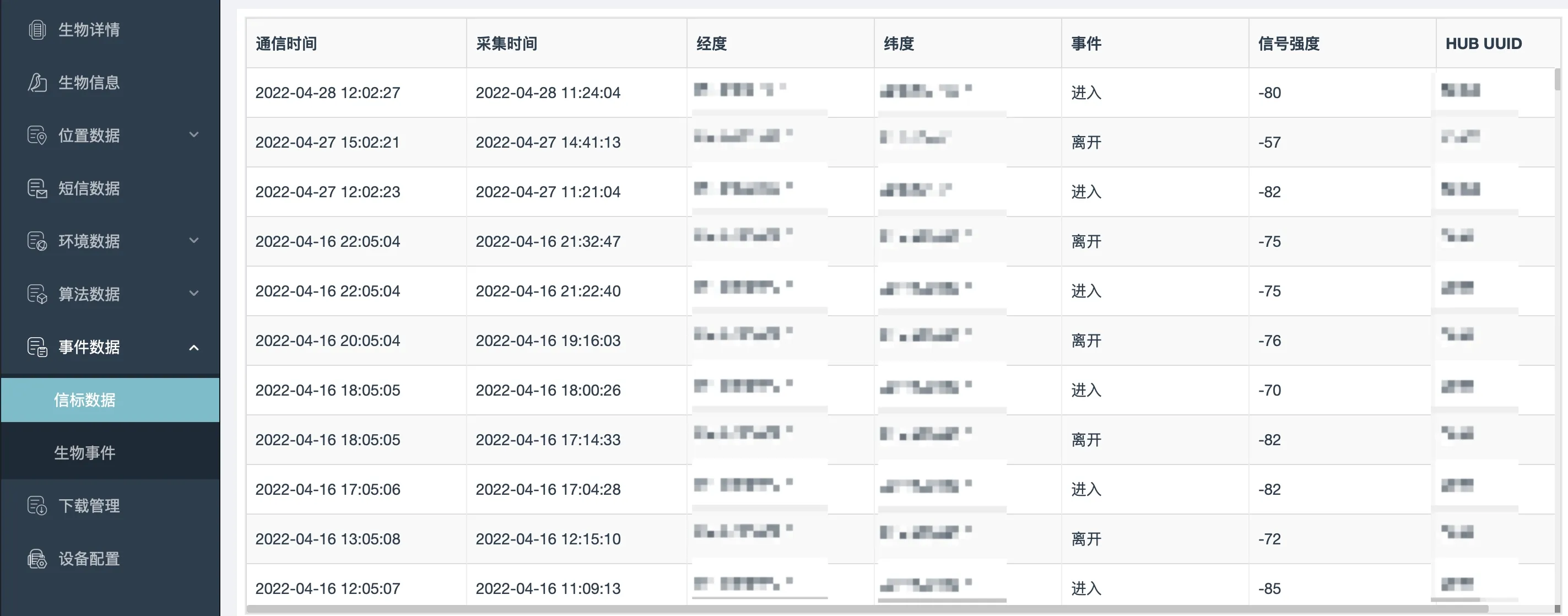 信标数据 显示在终端设备的页面上,用于显示终端设备何时进入或离开不同网关设备的 INTELINK 范围。