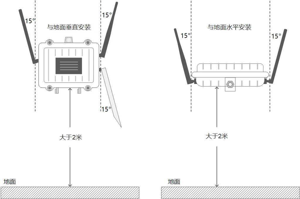 注意:为实现最大通讯范围,安装环境应为没有遮挡(例如墙壁、树木或山丘)的开阔地区,安装高度距地面至少 2 米。