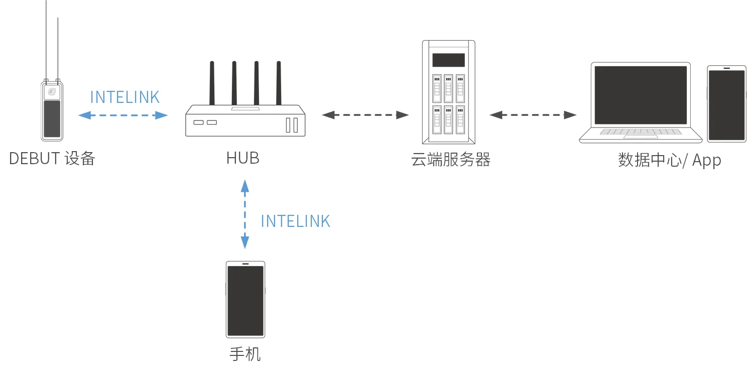 手机可用作 DEBUT 设备的网关,但通信距离有限。您可以使用 HUB 作为中继将通信距离延长至 1500 米(取决于实际环境)。