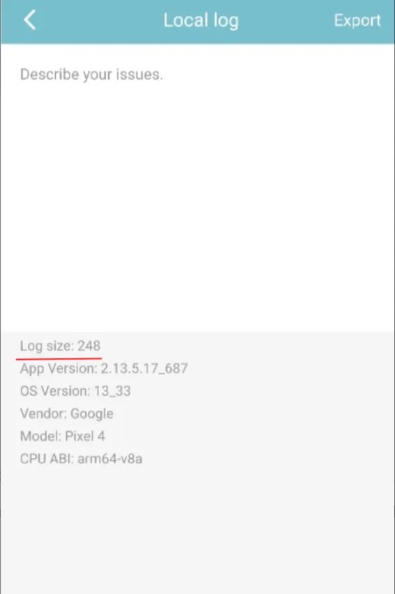 - If it is over 10,000, tap Export to save the log to your phone storage, then send it to us via IntelinkGO or email.