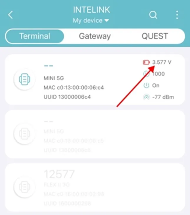 Use INTELINK feature of Ecotopia App to search for devices. Devices highlighted in the INTELINK scanning result page will show its current battery voltage, as below.