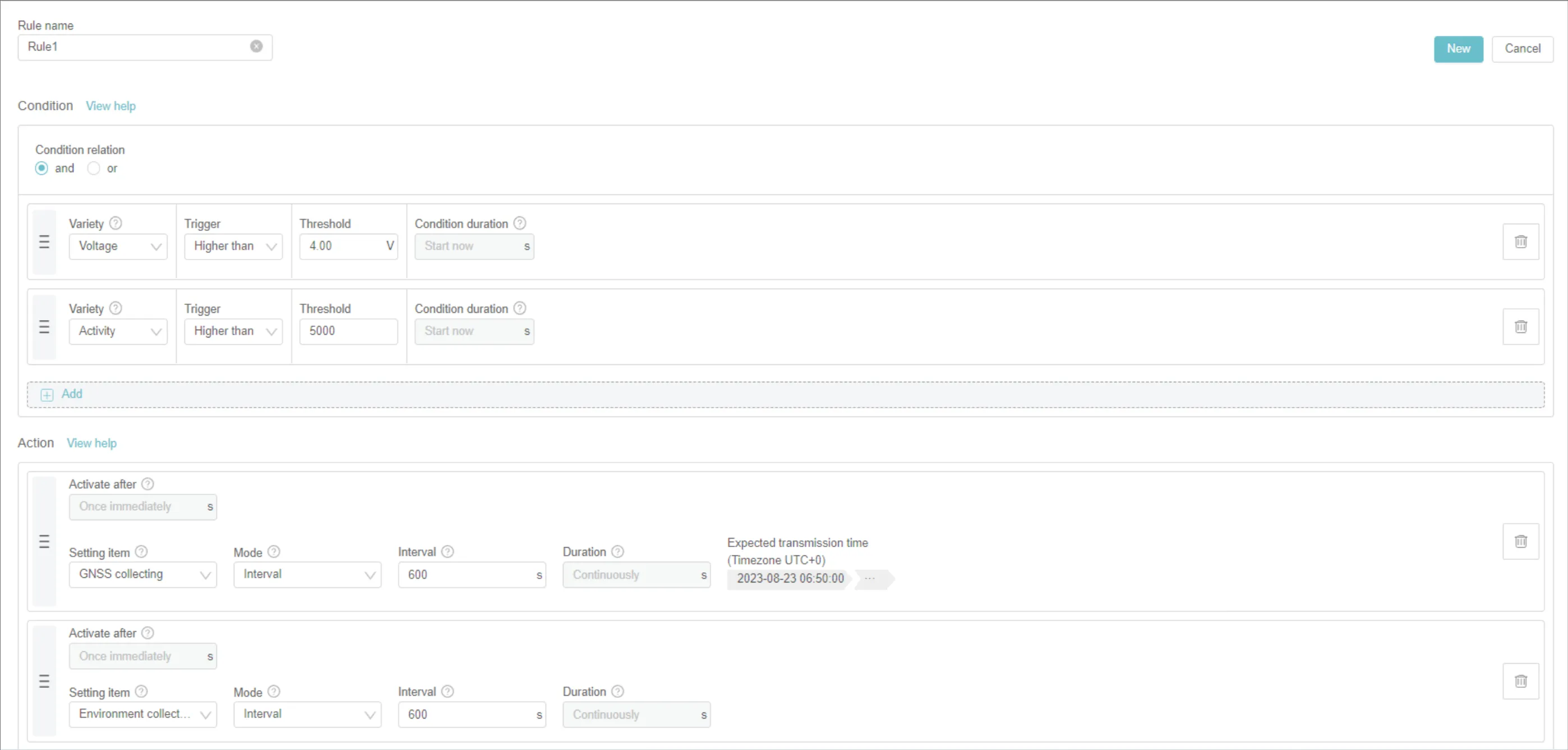 In order to ensure the stability of the tracking device's battery and enable it to work for a long time, the voltage threshold is set relatively high. If the required data period is not long and the research purpose is only to obtain data in the focus area, the voltage threshold can be lowered. The frequency setting for GNSS can be modified but not removed. Other Action items can be added or deleted according to your research purpose.