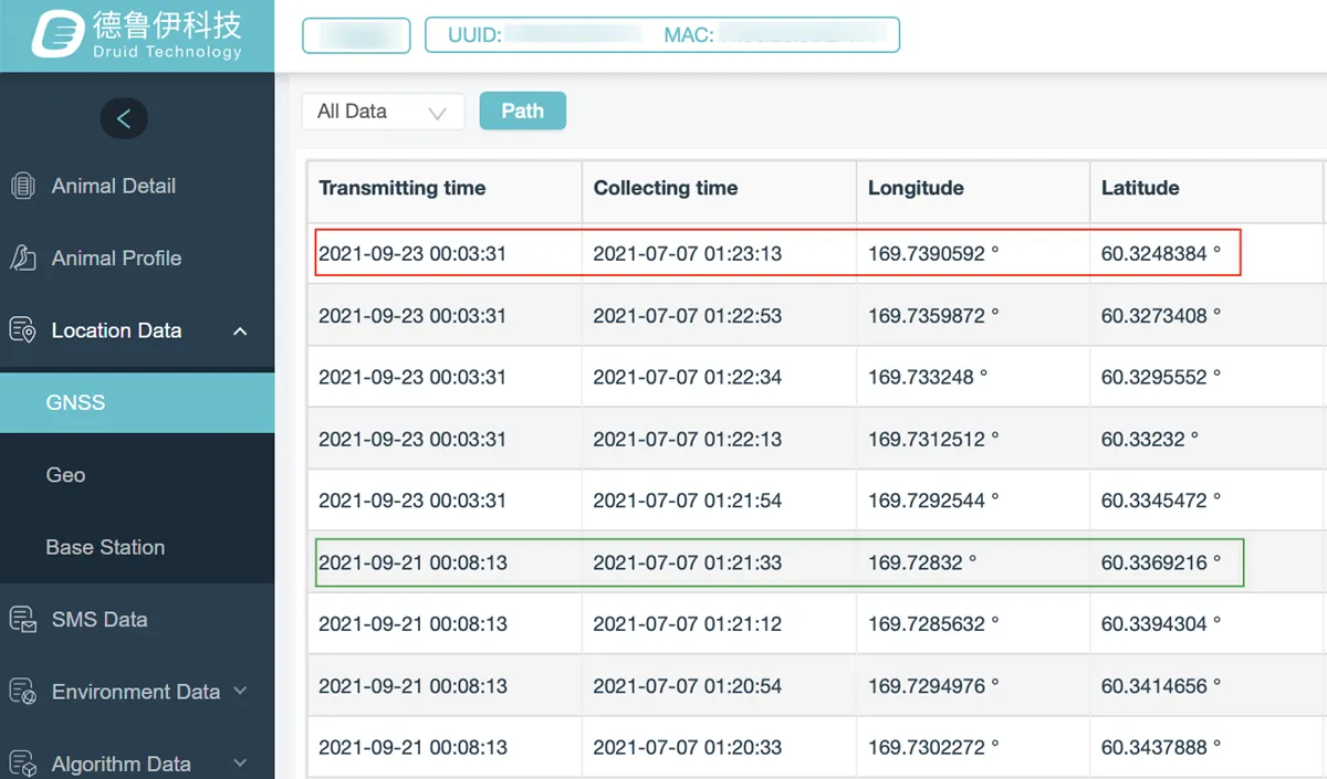For example, we are viewing track a device on 2021-09-23. The GNSS fix in red box is the last successfully transmitted GNSS fix. Under Day mode, the End is the GNSS fix in red box. However, under Year or Month mode, the End is the GNSS fix in green box, which was checked and included into the latest tracking route by system at exactly 2021-09-23 00:00:00. The GNSS fixes transmitted after it will be checked and included by system at 2021-09-25 00:00:00.