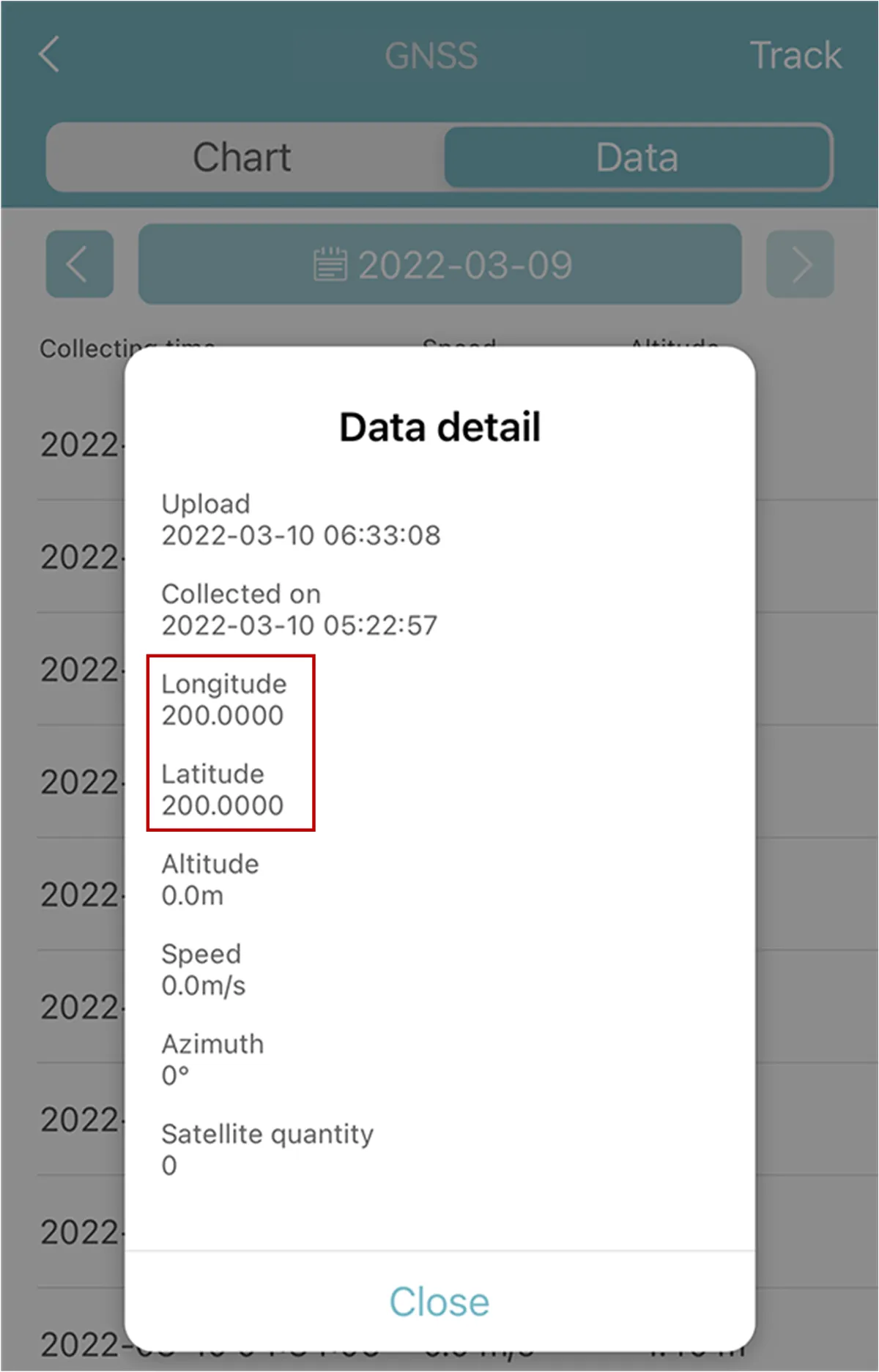 Also, when you check the GNSS data detail in Ecotopia App or check the downloaded GNSS data, you can see the values of Longitude and Latitude are both 200.00000.