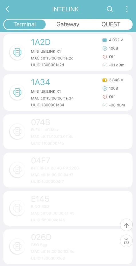 The App starts scanning for nearby devices. Devices detected by INTELINK are highlighted in the device list, while undetected devices are gray.