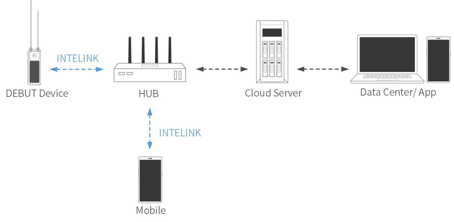 The flow-chart below shows how HUB functions as a gateway for communication between DEBUT devices and cloud server via cellular network. And you can also use your mobile phone to perform real-time operations on other DEBUT devices via HUB.