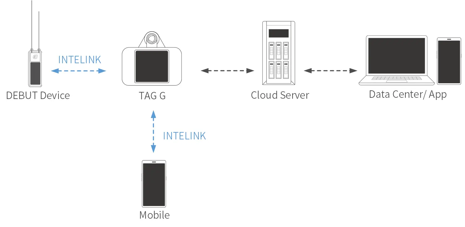 The flow-chart below shows how TAG G functions as a gateway for communication between Debut devices and cloud server via cellular network. And you can also use your mobile phone to perform real-time operations on other Debut devices via TAG G (relay mode).