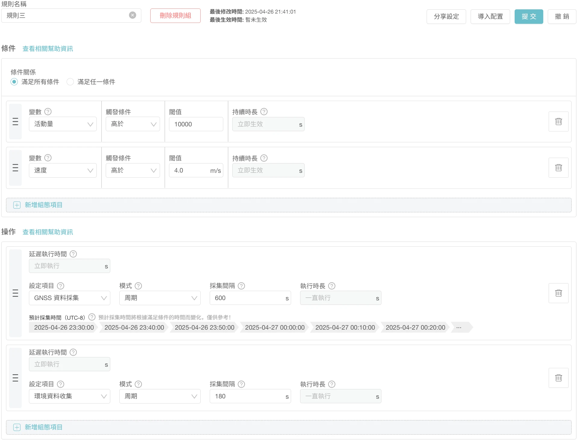 規則组 條件 操作 規則一 與 電壓 > 3.9 GNSS 1 小时 ODBA 5 分钟 規則二 與 ODBA > 5,000 電壓 > 3.85 GNSS 30 分钟 ODBA 5 分钟 規則三 或 ODBA > 10,000 速度 > 4 m/s GNSS 10 分钟 環境數據 3 分钟