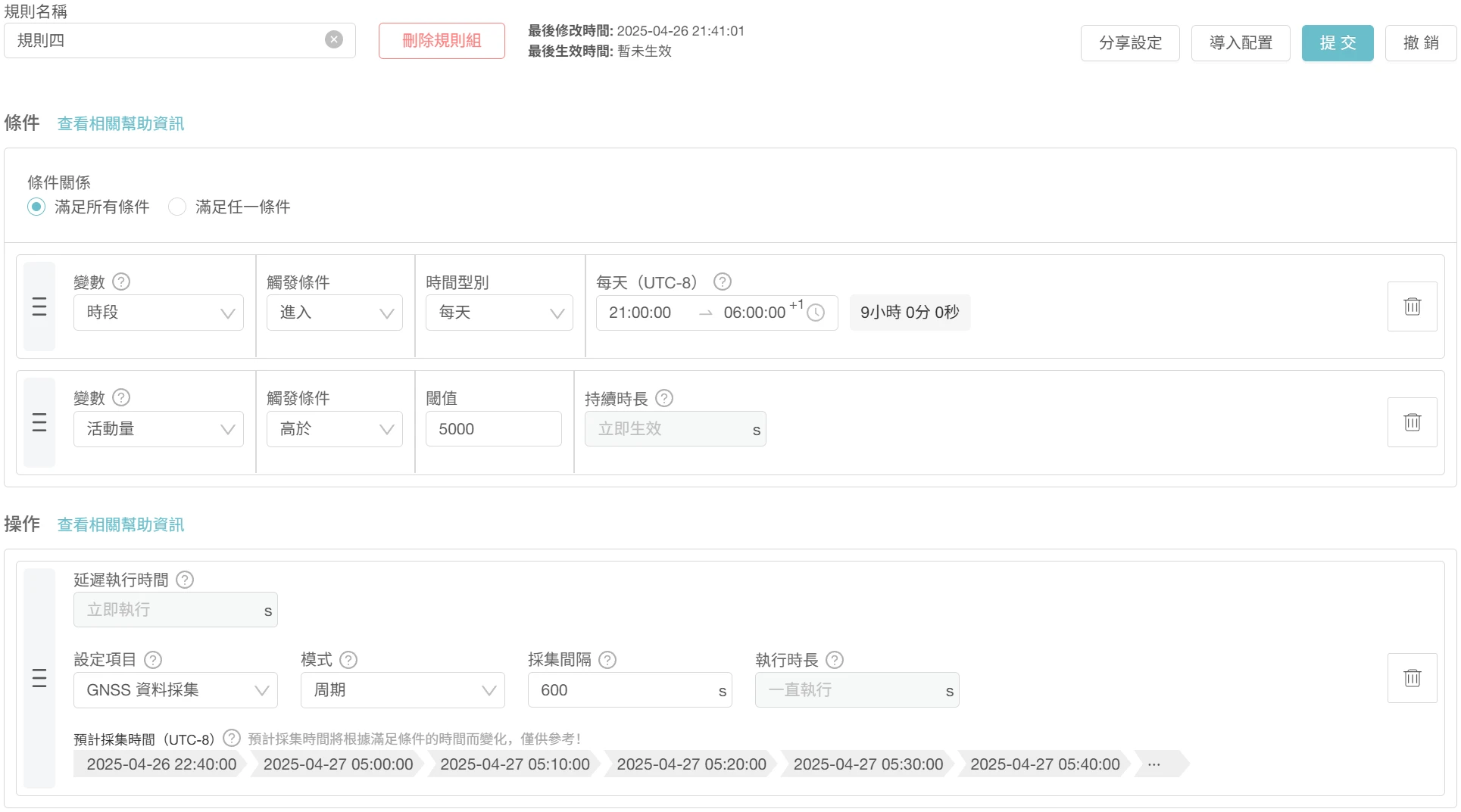 規則三進入每日時間段 21:00 ~ 06:00GNSS 关闭