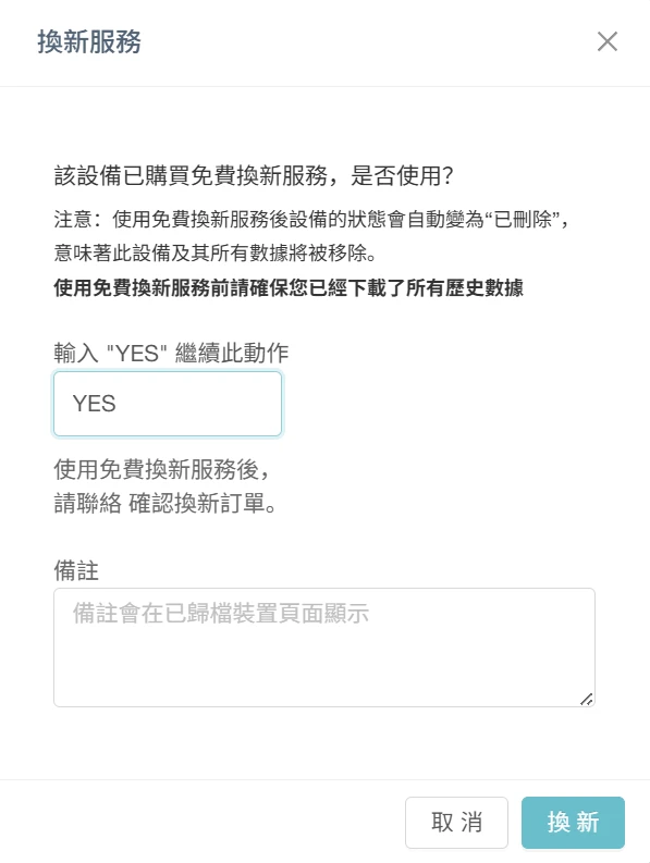 注意:Debut 終生無條件換新服務激活後,裝置的數據訂閱狀態將自動變為“停止”。這意味著該裝置的所有信息和採集的全部數據將從您賬戶下被清空且無法恢復。在您激活 Debut 終生無條件換新服務前,請確保您已將該裝置採集的數據下載到本地。
