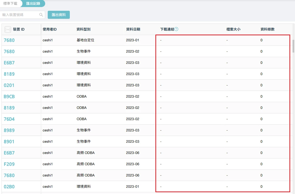 數據中心將在後臺開始生成數據,您可以在頁面上看到生成進度。生成數據所需時間視數據量而定。數據生成完畢後,在下載列表中找到需要下載的數據,然後單擊“下載鏈接”進行下載。如果您下載了多個裝置的數據,您可以在頂部搜索欄輸入裝置編號進行查找。